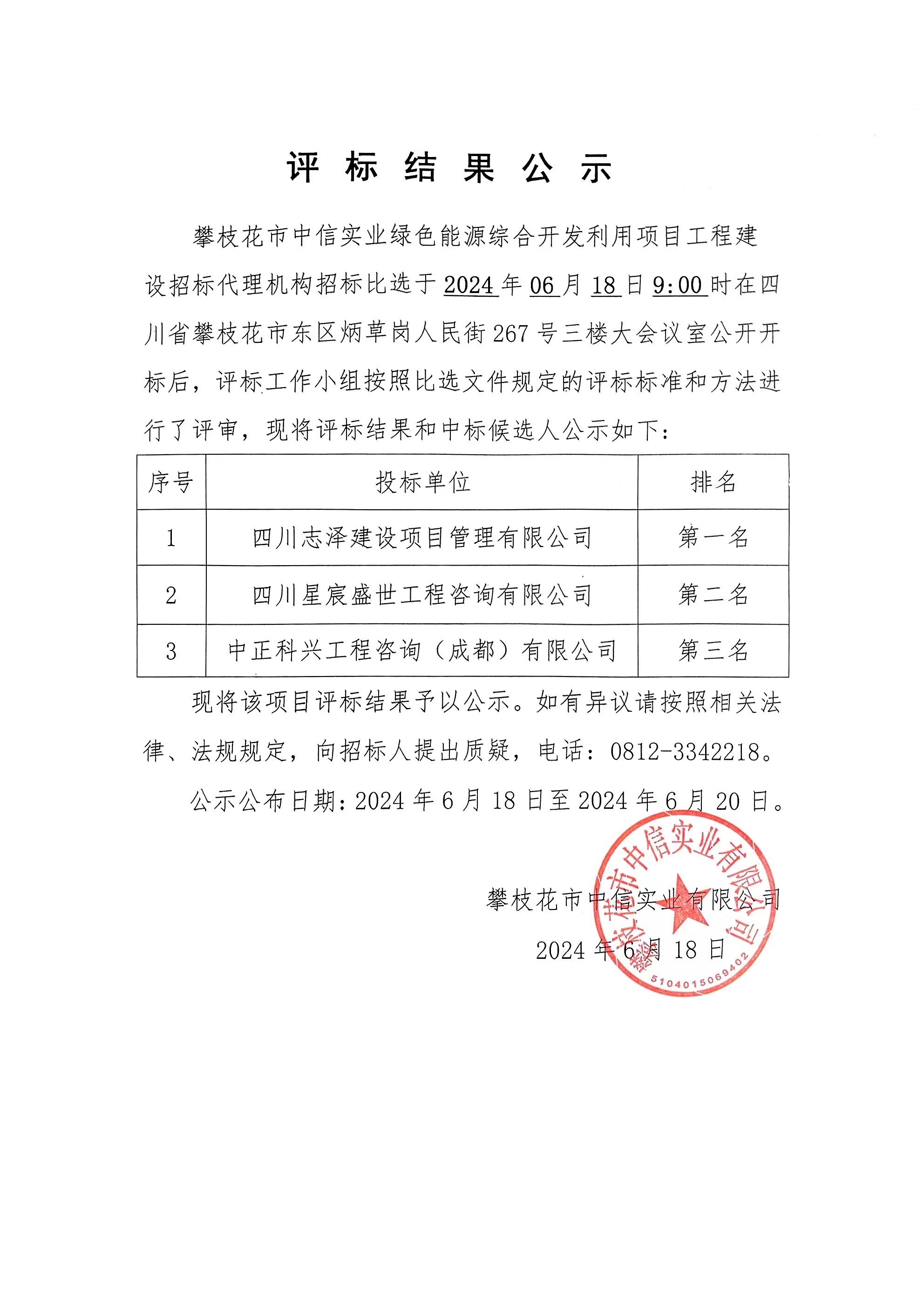 攀枝花市中信實業(yè)有限公司綠色能源綜合開發(fā)利用項目工程建設(shè)招標(biāo)代理機構(gòu)招標(biāo)比選評標(biāo)結(jié)果公示